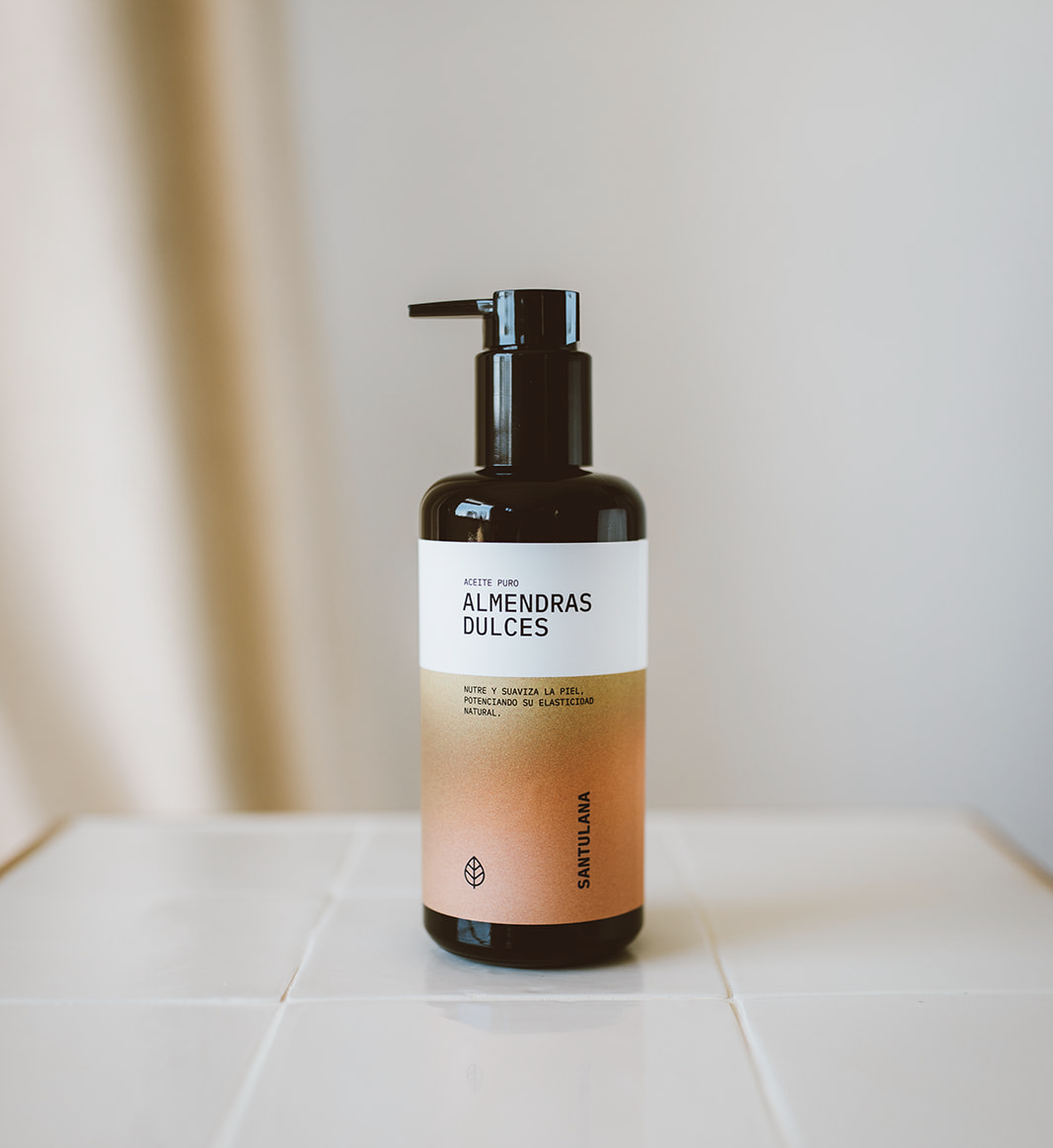 Aceite de Almendras Dulces virgen obtenido por primera presión en frío mediante procesos exclusivamente mecánicos, cuidado y elaborado en Tarragona por una pequeña empresa familiar.