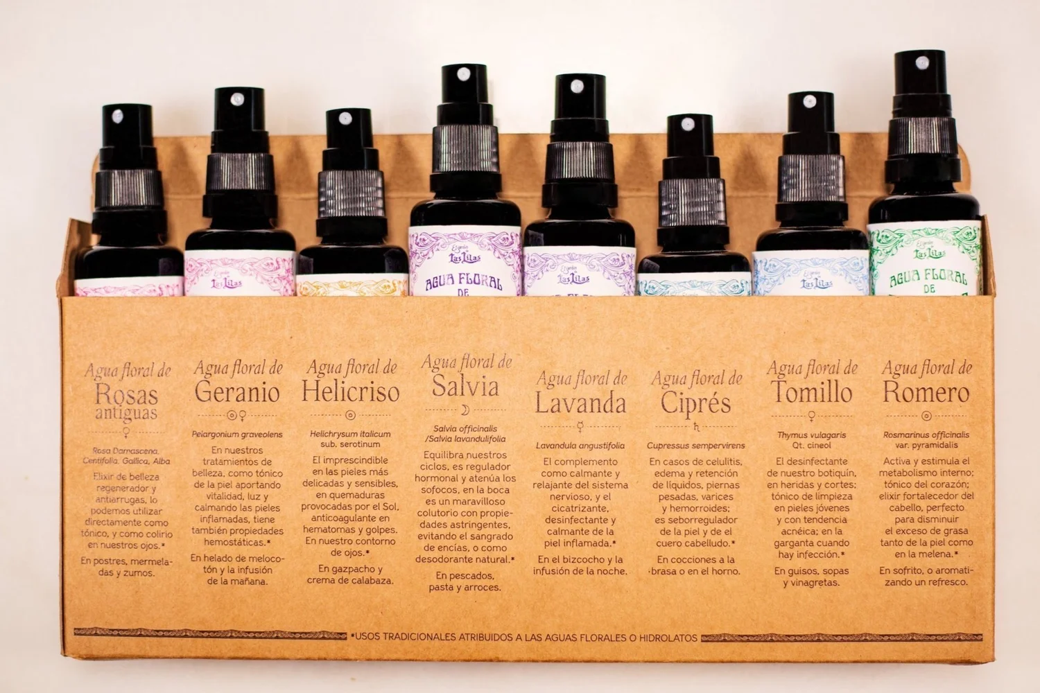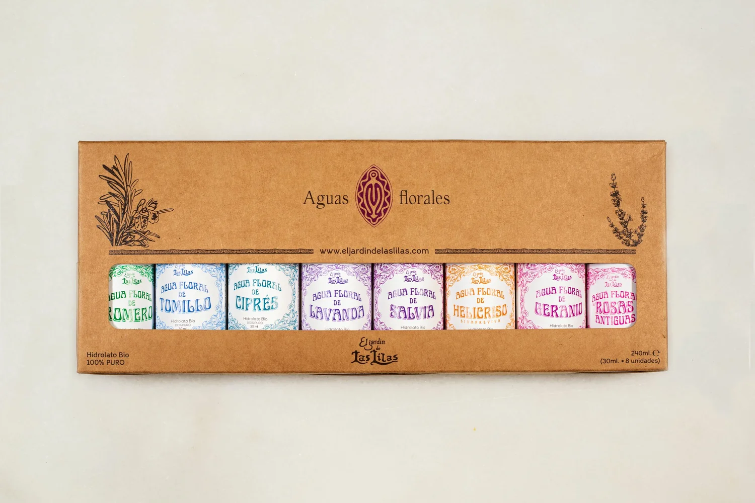 Toda la magia de nuestros hidrolatos de 30ml. junta en un solo pack para que te acompañen allá donde vayas: Helicriso, Lavanda, Rosas Antiguas, Romero, Tomillo, Geranio, Salvia y Ciprés.
