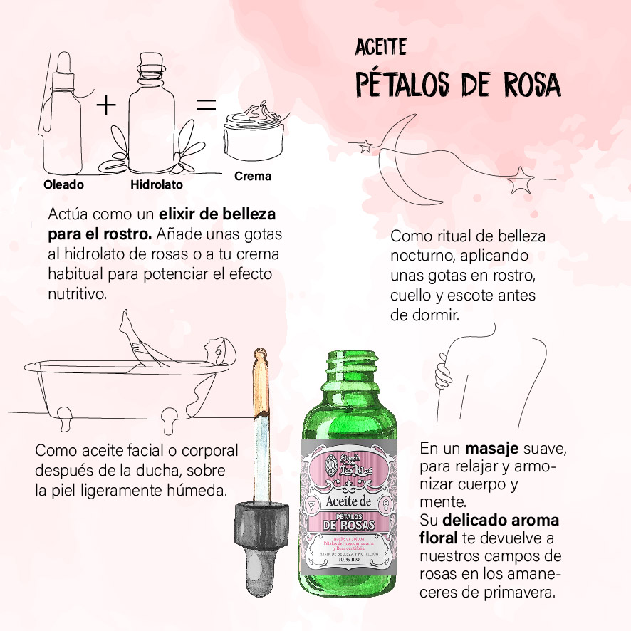 El oleado de pétalos de rosa es un cuidado natural que combina tradición y delicadeza. Inspirado en la técnica francesa del enfleurage, se elabora macerando pétalos frescos, recolectados a mano al amanecer, en aceite de jojoba ecológico. Durante este proceso pausado, cada flor va transfiriendo sus compuestos aromáticos y propiedades, dando como resultado un aceite equilibrante, nutritivo y de exquisito aroma floral.